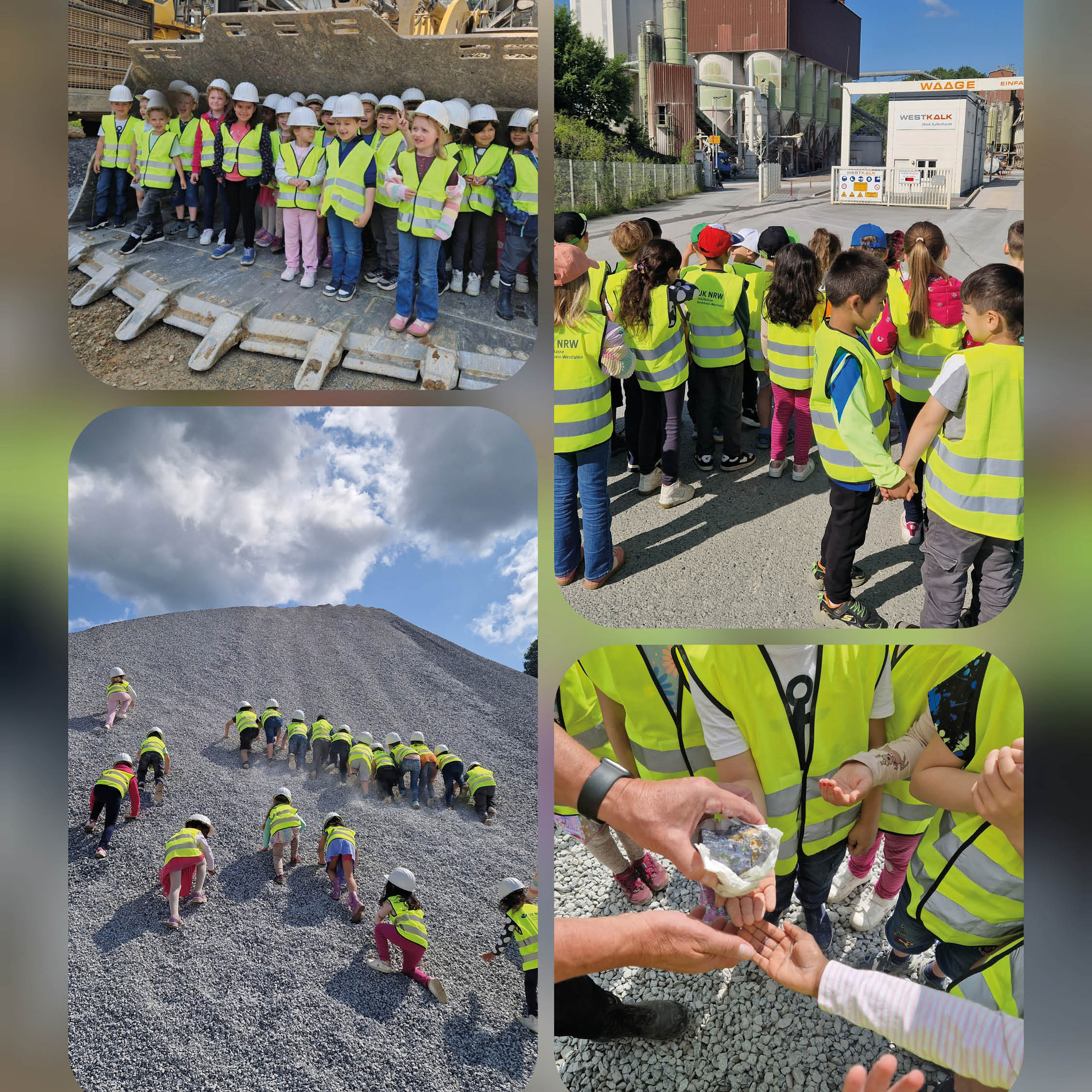 Die Kids haben sich vom Technischen Leiter der WESTKALK, Guido Mausbach, die großen Maschinen 🚜 erklären lassen und sind einen Splitt-Haufen 🪨⛰️ hinaufgeklettert.